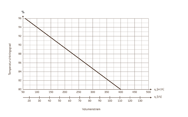 TemperaturvirkningsgradTemperaturvirkningsgrad for aggregat med motstrømsvarmeveksler. Testet i henhold til EN13141-7, tørr virkningsgrad. NB! Temperaturvirkningsgraden, er for motstrømsveksleren alene (uten varmepumpedrift). |