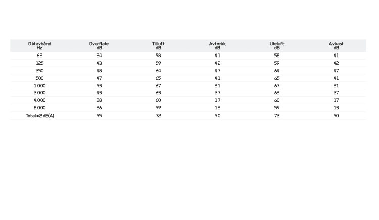 LyddataLyddata er for qv = 600 m3/h og Pt ext = 100 Pa i henhold til EN 9614-2 for overflate og EN 5136 for kanaler. Lydeffektnivået LWA faller med fallende luftmengde og fallende mottrykk. Lydtrykknivået LpA i 1 m fra aggregatet. |