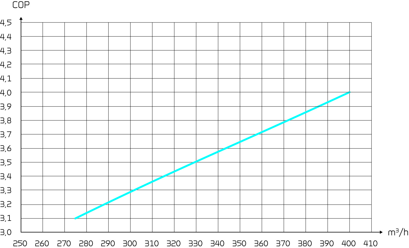 EnergieffektivitetsforholdEnergieffektivitetsforhold EER [-] for tilluft som funksjon av volumstrøm [m3/h] iht. EN 14511 ved avtrekkslufttemperatur = 27 °C og utelufttemperatur = 35 °C. NB! COP iht. EN 14511 måles for varmepumpe og motstrømsveksler kombinert. |