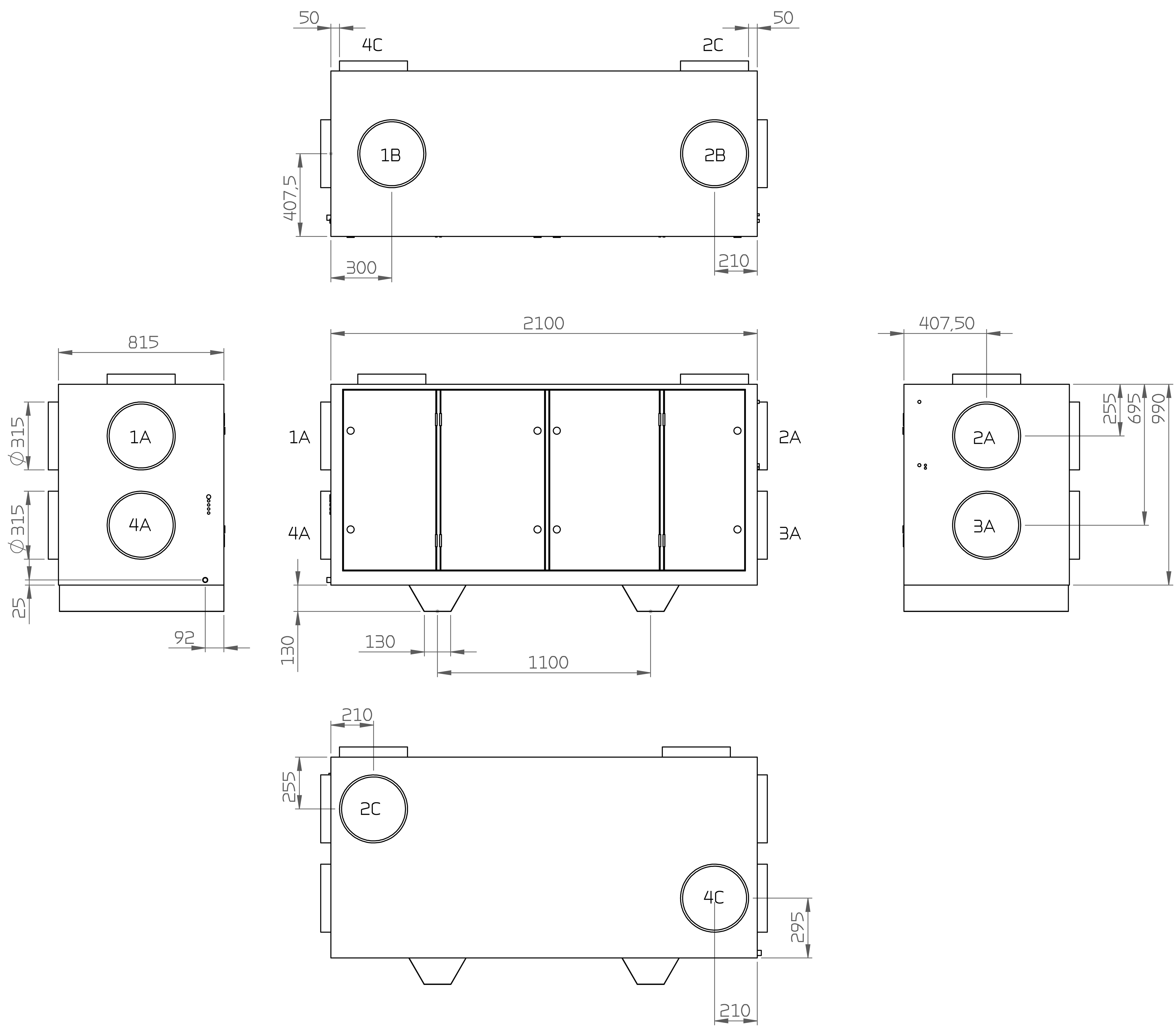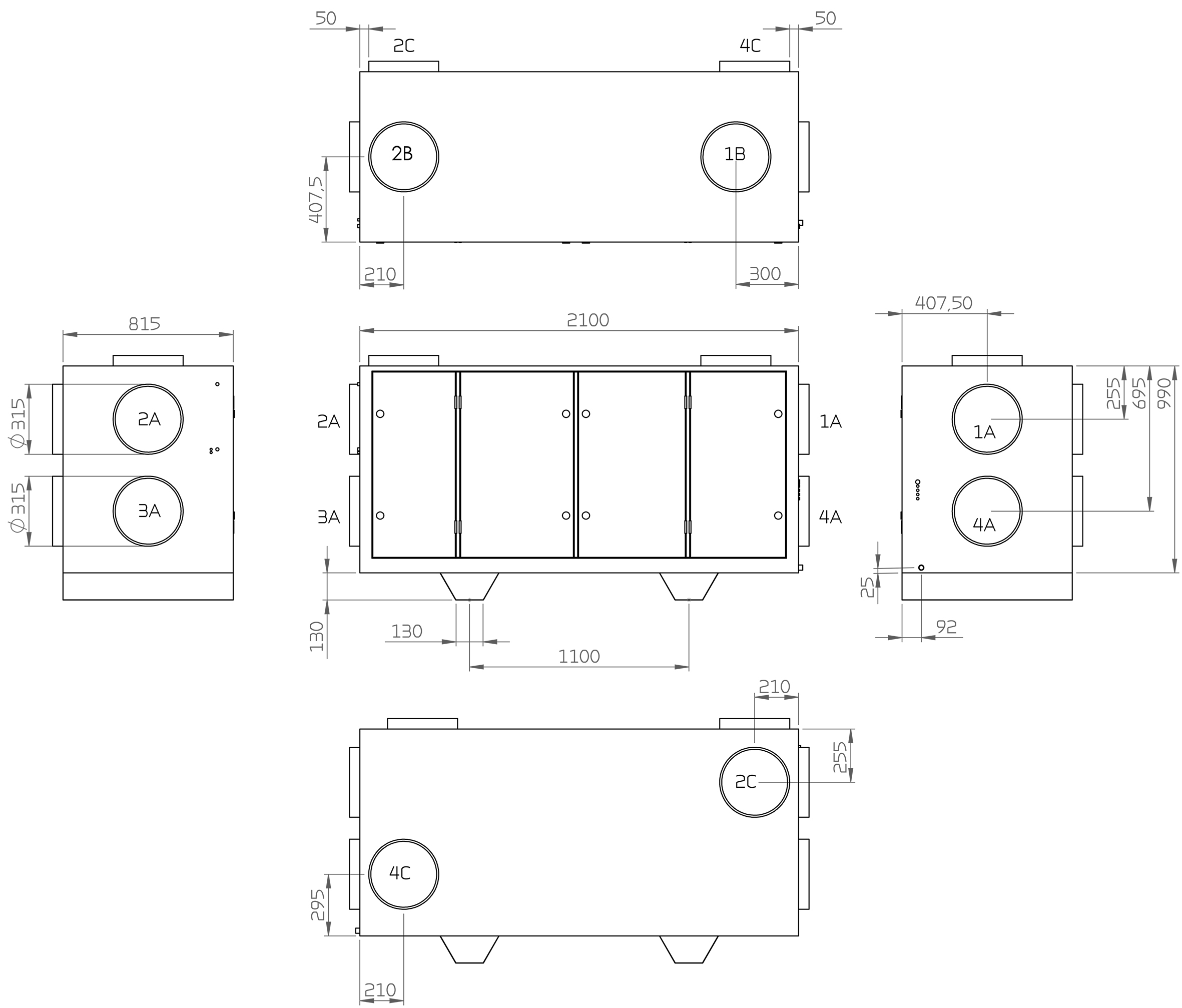 Alle mål er vist i mm. 1: Uteluft A: Gavlplassering |