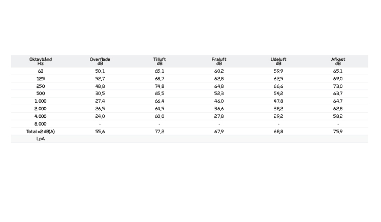 LyddataLyddata er for qv = 1200 m3/h og Pt ext = 200 Pa i henhold til EN 9614-2 for overflate og EN 5136 for kanaler. |
