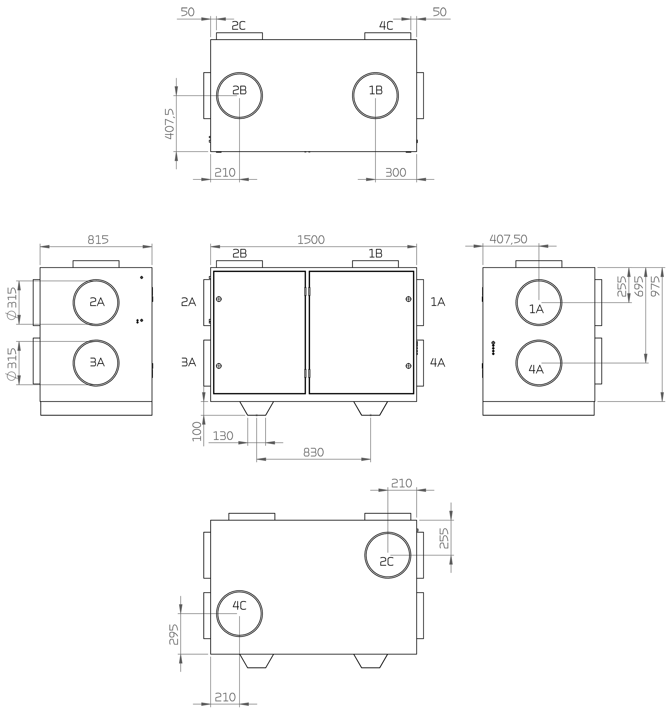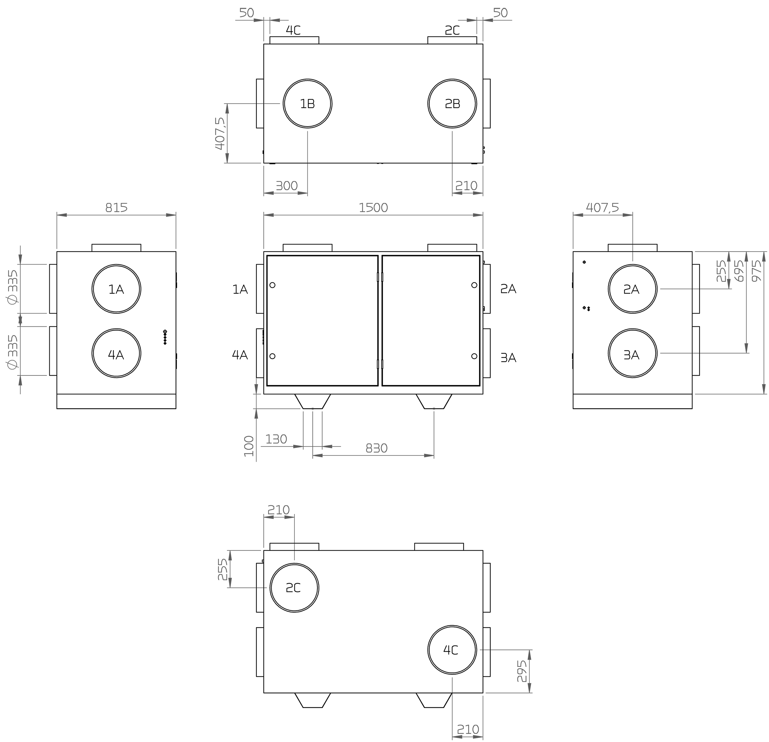 Alle mål er vist i mm. 1: Uteluft A: Gavlplassering |