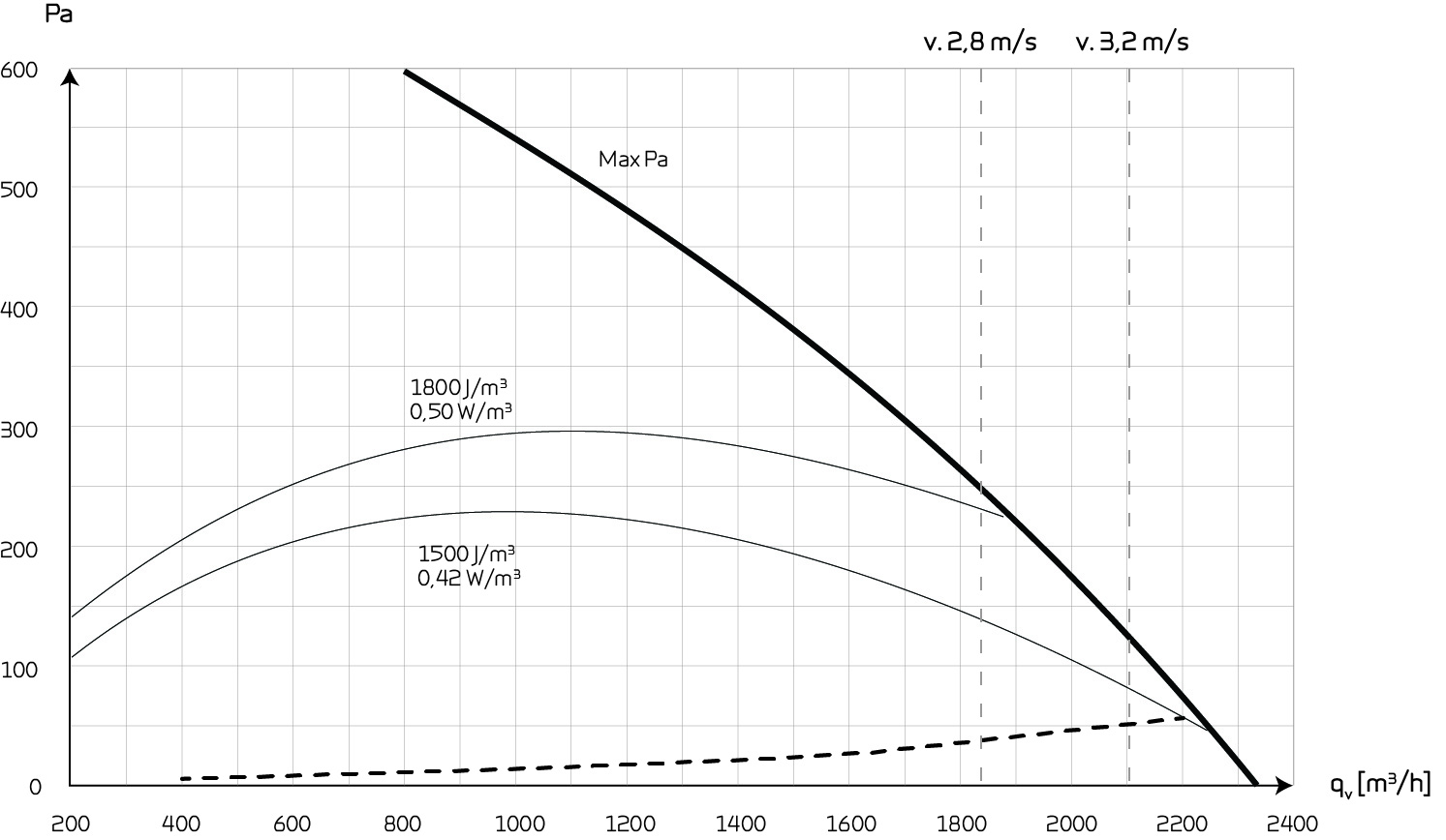 Kapasitet (kondensasjonsveksler)Prosjekteringsdata er beregnet på grunnlag av en kondensasjonsveksler. Max Pa kapasitet af standardaggregat, Pt ext som funksjon av qv med hensyn til SFP-Verdiene. SFP-verdier iht. EN 13053 er for standardaggregat med ISO ePM10 >60% (M5) og ISO ePM1 50% (F7) filtre og uten varmebatteri. * Lufthastighet over fordamperoverflaten måles ved meter per sekund. OBS! SFP-verdiene måles og oppgis som en totalverdi for begge viftene. |