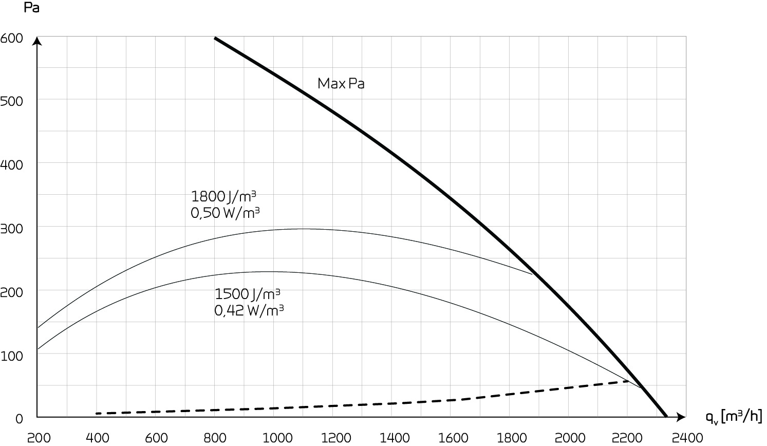 Kapasitet (kondensasjonsveksler)Prosjekteringsdata er beregnet på grunnlag av en kondensasjonsveksler. Max Pa kapasitet af standardaggregat, Pt ext som funksjon av qv med hensyn til SFP-Verdiene. SFP-verdier iht. EN 13053 er for standardaggregat med ISO ePM10 >60% (M5) og ISO ePM1 50% (F7) filtre og uten varmebatteri. OBS! SFP-verdiene måles og oppgis som en totalverdi for begge viftene. |