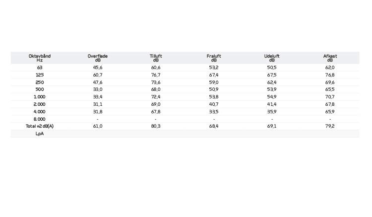 LyddataLyddata er for qv = 3600 m3/h og Pt ext = 200 Pa i henhold til EN 9614-2 for overflate og EN 5136 for kanaler. |