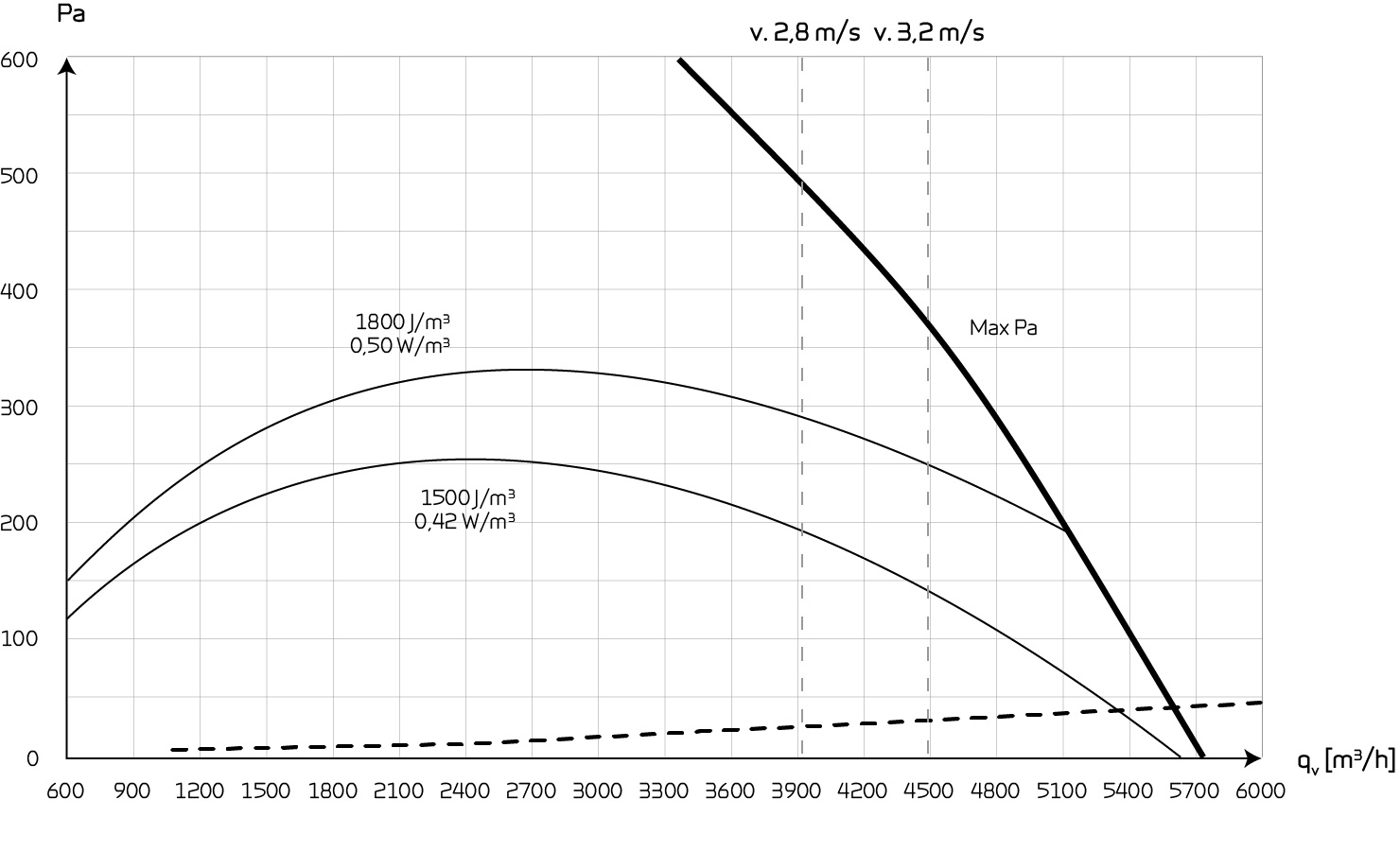 Kapasitet (kondensasjonsveksler)Prosjekteringsdata er beregnet på grunnlag av en kondensasjonsveksler. Max Pa kapasitet af standardaggregat, Pt ext som funksjon av qv med hensyn til SFP-Verdiene. SFP-verdier iht. EN 13053 er for standardaggregat med ISO ePM10 >60% (M5) og ISO ePM1 50% (F7) filtre og uten varmebatteri. * Lufthastighet over fordamperoverflaten måles ved meter per sekund. OBS! SFP-verdiene måles og oppgis som en totalverdi for begge viftene. |