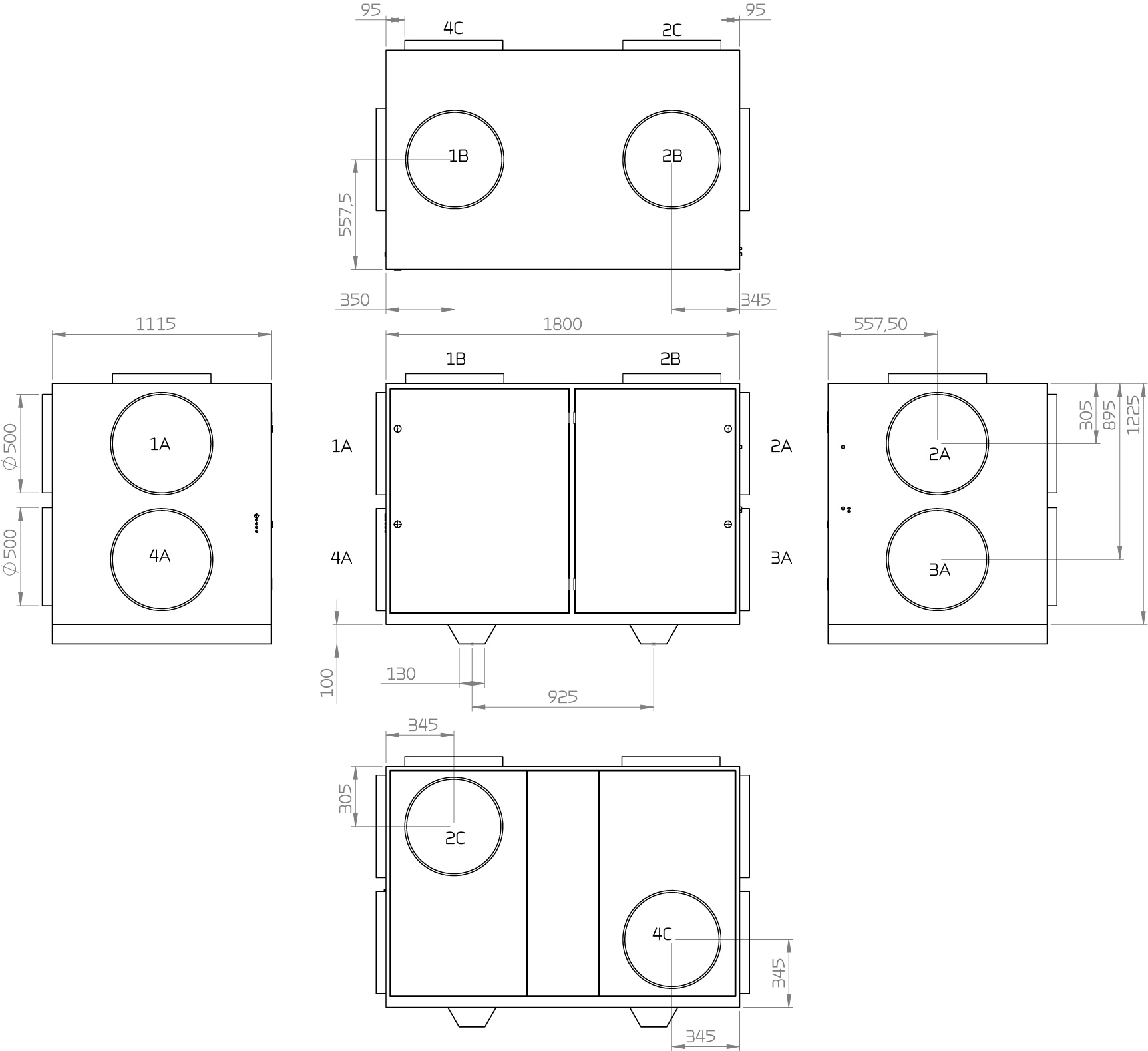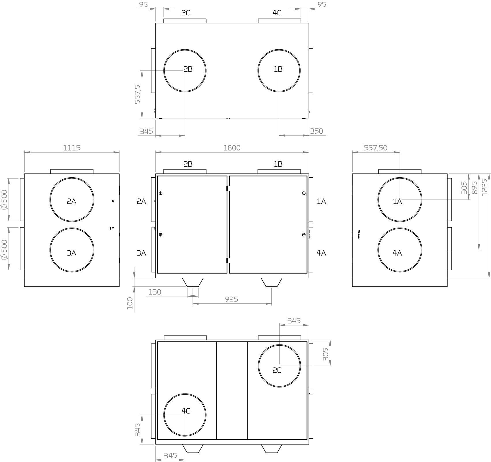 Alle mål er vist i mm. 1: Uteluft A: Gavlplassering |