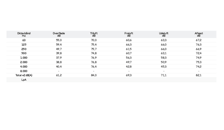 LyddataLyddata er for qv = 4800 m3/h og Pt ext = 200 Pa i henhold til EN 9614-2 for overflate og EN 5136 for kanaler. |